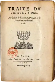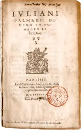 - (la) Juliani Palmarii de Vino et pomaceo libri duo, Paris, Guillaume Auvray, , 76 p., in-8º (OCLC 1449237479, lire en ligne sur Gallica). — Édition originale en latin du traité du vin et du cidre.