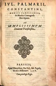 - ↑ (la) Iulii Palmarii Constantini medici Parisiensis, De morbis contagiosis : libri septem, Paris, Denis Duval, , [16], 552, [32] p. ;, 7 vol. in-8º (OCLC 801303364, lire en ligne sur Gallica), chap. 22 (« Descripta curationis per sudores confirmatio »), p. 401 sqq..