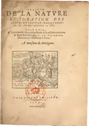 - ↑ Ambroise Paré, Les Œuvres d'Ambroise Paré : divisées en vingt neuf livres. Reveues et augmentées par l'Autheur, peu auparavant son decez, Paris, , 10 reveue ..., corrigée ... et augmentée d'un ... traicté des fièvres ... et de la curation d'icelles ... avec les pourtraits et figures, tant de l'anatomie, que des instrumens de chirurgie, etc. éd., in-f° (OCLC 562965464, lire en ligne), p. 286.