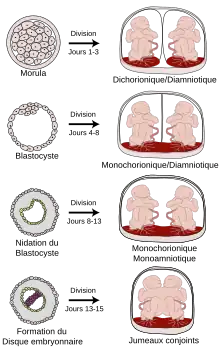 • Les termes monozygotes bichorioniques ou biamniotiques caractérisent de vrais jumeaux lorsque l'œuf initial se scinde très précocement, le jour de la fécondation (fusion du spermatozoïde avec l'ovule). Dans ce cas, les deux œufs issus de la division vont s'implanter à l'aide de placentas distincts. Les embryons ainsi constitués auront chacun un chorion[1] et un amnios[2] (appelé également poche des eaux) propres.