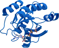 KRAS (V-Ki-ras2 Kirsten rat sarcoma viral oncogene homolog), codé par le gène KRAS situé sur le chromosome 12 humain de 21 kDa[5], est une petite GTPase[6] jouant un rôle clé dans la genèse de plusieurs cancers. Elle fait partie de la famille des protéines Ras, un type de protéine G monomérique (à ne pas confondre avec les protéines G trimériques, qui sont bien plus grosses). Son nom provient de son gène orthologue chez le Kirsten Rat Sarcoma virus[7], un virus induisant des sarcomes chez les rats chez qui la protéine a été découverte en 1979[8]. KRAS fait partie des premiers oncogènes identifiés, le tout premier étant le gène Src en 1970[9], ce dernier ayant valu le prix Nobel de médecine et de physiologie en 1989 à ses découvreurs.