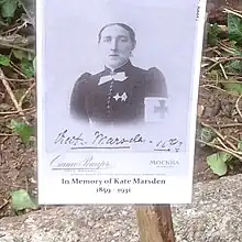 Kate Marsden, née le à Edmonton, et morte le à Londres, était une exploratrice, missionnaire, auteure et infirmière britannique. Soutenue par la reine Victoria et l'impératrice Marie Fedorovna de Russie, elle tenta de trouver un remède pour guérir la lèpre. Pour cela, elle organisa une expédition de Moscou en Sibérie et y installa un centre de traitement de la lèpre. Elle retourna, ensuite, en Angleterre où elle inspira la création du Bexhill Museum, mais dut malheureusement se retirer en tant qu'administratrice. En effet, après son retour de Sibérie, ses finances et ses motivations furent remises en question. Elle fut également confrontée à l'homophobie de ses détracteurs qui, à cause de son orientation sexuelle, réussirent presque à monter un procès du « style Oscar Wilde » contre elle. Kate Marsden, fut néanmoins, élue membre de la Royal Geographical Society; un diamant porte son nom et une statue en son honneur a été érigée en Sibérie, au village de Sosnoska en 2014 [1].