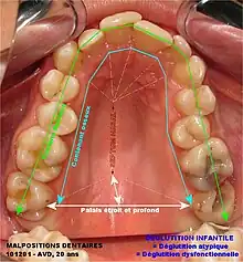 La déglutition infantile, ou déglutition primaire, caractérise la fonction linguale chez tous les nourrissons et les enfants : ce réflexe naît au quatrième mois de la grossesse (réflexe inné) et elle se manifeste par une langue qui s'étale horizontalement entre les deux maxillaires, ou « interposition linguale ». Chez plus de 75 % des adultes, un étalement horizontal persistant de la langue devient une dysfonction : c'est la déglutition atypique, ou déglutition dysfonctionnelle. Les logopèdes (Belgique) / orthophonistes (France) tentent, tant bien que mal, de corriger cette interposition linguale via des exercices volontaires, ou myothérapie fonctionnelle (MTF). Mais, face à l'automatisme inné des réflexes de la déglutition salivaire, l'efficacité de la MTF reste sujette à caution. Une déglutition atypique favorise la respiration buccale, accompagnée d'une étroitesse des mâchoires et d'un manque de place pour aligner toutes les dents permanentes. Ceci peut conduire aux malocclusions ou aux dysfonctions des mâchoires : SADAM, DAM, STM, etc.