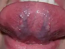 - une couche jaune, d'un certain aspect, sur la langue peut indiquer un diabète à un certain stade[20]. S'il s'agit d'un diabète de type 2, la langue est bleutée sous ce revêtement jaune ;