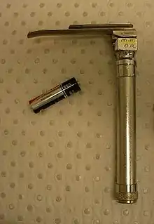 - Un manche servant à manipuler l'instrument. Il contient les batteries et, dans le cas des laryngoscopes à fibre optique, la source lumineuse.