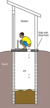 La fosse est creusée en général à la pelle et à la pioche, de préférence dans un sol meuble mais pas trop absorbant afin d'éviter les infiltrations. Elle fait couramment un mètre de diamètre (taille suffisante pour pouvoir y creuser sans prendre trop de place), et a une forme circulaire : bien que le creusement soit plus difficile ainsi sans moyens mécaniques, cela rend les parois plus résistantes à l'effondrement[1]. La profondeur de la fosse varie avec la dureté du sol, la proximité de la nappe phréatique et le coût estimé : les profondeurs « standard » lors des programmes publics de construction de latrines sont souvent de 1,5 m si la nappe phréatique est proche, et de 2 à 3 m si le sol le permet ; mais on a déjà rapporté des fosses de plus de 15 m de profondeur, qui ne seront probablement jamais pleines.