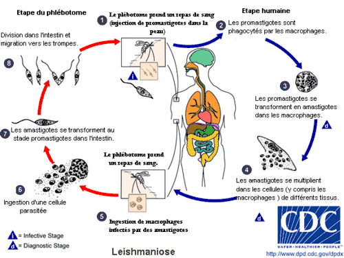 Le phlébotome est l'hôte intermédiaire et le vecteur du Leishmania. Lorsqu'une phlébotome femelle se nourris du sang d'un mammifère infecté, des amastigotes présents dans le sang deviennent des promastigotes. Ils se multiplient et se logent dans le pharynx de la phlébotome, pour se préparer à infecter le prochain hôte. Au bout de 10 jours, la phlébotome devient contagieuse. Lors de son prochain repas de sang, les promastigotes entreront le système sanguin de l'hôte. Des macrophages mangent alors le promastigote, le transformant en amastigote qui se reproduit à l'intérieur du macrophage. La pression osmotique fait alors éclater le macrophage, libérant les promastigotes qui peuvent alors infecter de nouvelles cellules.