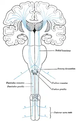 Les voies nerveuses centrales sensitives (le lemnisque médian est marqué au centre à droite).