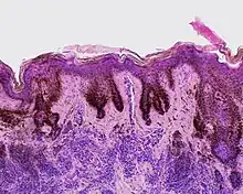 L’examen histologique montre une hyperpigmentation localisée de l’épiderme consécutive à une importante augmentation du nombre de mélanocytes de la couche basale, sans regroupement en thèques. Les crêtes épidermiques sont allongées[2].
