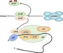 Une voie de contrôle de la synthèse protéique passe par la phosphorylation de la protéine eIF4E (en), effectuée par mTORC1 (fig. 1). La protéine 4E-BP1 est liée étroitement au facteur d'initiation eIF4E qui est responsable du recrutement du complexe d’initiation au niveau de la coiffe des ARNm (fig. 3). Une fois le complexe mTORC1 activé, il phosphoryle 4E-BP1 qui se désolidarise alors de eIF4E, permettant le recrutement d’une autre protéine, eIF4G et par incidence de eIF4A à l’extrémité 5’ d’un ARNm. Le complexe ainsi formé, constitue avec le ribosome le complexe 48S qui permet le démarrage (initiation en anglais) de la traduction des ARN messagers Cap-dépendants[29],[n 5].