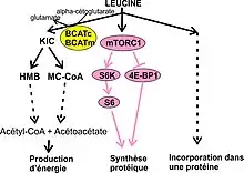 - Être catabolisée : le transfert du groupe α-aminé de la leucine à l’α-cétoglutarate pour former du glutamate et de l’α-cétoisocarproate (KIC) est catalysée par BCATm et BCATc. Environ 20 % de la leucine est convertie en KIC[7]. Cette étape est appelée la transamination ;
