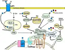 La régulation du complexe mTORC1 par les acides aminés est connue depuis la fin des années 1990 par les travaux de Hara et al.[25] démontrant qu’une carence en acides aminés, notamment en leucine, supprime la phosphorylation des deux voies aval, S6K1 et 4E-BP1 (voir fig. 1), même en présence de facteurs de croissance. Le mécanisme de cette régulation a commencé à être compris en 2008 quand les protéines RAG[n 4] et leurs rôles ont été identifiés. Le complexe des RAG, associé au RAGULATOR, est responsable de l’ancrage du complexe mTORC1 à la membrane du lysosome[24].