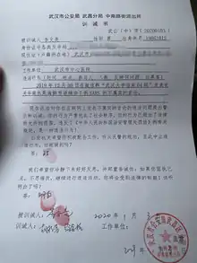 - ↑ (zh) « 武汉市公安局吴昌分局中南路街派出所训诫书 », Zhongnanlu Street Police Station, Wuchang Division of Wuhan Police Bureau, (consulté le )