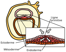La ligne primitive[1] apparaît lors de la gastrulation. Il s'agit d'un épaississement cellulaire se formant sur la face dorsale du disque embryonnaire, s'étendant sur les deux tiers de sa longueur. Cette ligne détermine l'axe longitudinal de l'embryon. Les cellules s'enfoncent au niveau de la ligne primitive pour former les trois couches cellulaires desquelles dériveront tous les organes : l'endoderme, le mésoderme et l'ectoderme. Le mésoderme se formera directement sous la ligne primitive en avant du Nœud de Hensen de part et d'autre d'un tube, l'axe organisateur, appelé notochorde.