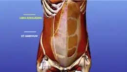 En anatomie humaine, la ligne semi-lunaire[1] (ou ligne semi-lunaire de Spieg(h)el ou carrefour musculo-aponévrotique de la paroi abdominale antérieure ou charnière aponévrotique de la paroi abdominale antérieure ou bande de Spiegel ou sillon latéral du ventre de Gerdy) est la ligne incurvée qui marque la transition entre le muscle oblique externe de l'abdomen et le muscle droit de l'abdomen.