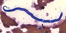 Les adultes produisent des « microfilaires » mesurant 250 à 300 μm sur 6 à 8 μm, qui sont engainés et ont une périodicité diurne. Des microfilaires ont été retrouvées dans le liquide céphalo-rachidien, les urines, et les crachats.