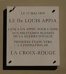- ↑ Bien que Louis Appia et Henri Dunant se trouvent en 1859 pour une courte période dans le même secteur du Nord de l'Italie et se consacrent tous deux à aider les blessés, leurs notes et autres souvenirs n'indiquent pas qu'ils se soient rencontrés à ce moment-là ou eurent connaissance de l'action menée par l'autre. Même si une telle rencontre ne puisse pas être exclue, elle apparaît tout de même peu vraisemblable.