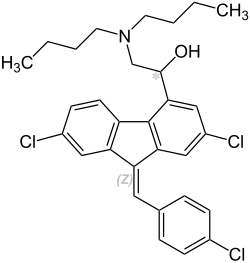 La luméfantrine est un médicament antipaludéen destiné à traiter les cas de paludisme à Plasmodium falciparum non compliqué[2]. Elle est toujours utilisée en association fixe avec l'artéméther dans un rapport artéméther/luméfantrine de 1:6, les monothérapies à la luméfantrine n'étant approuvées nulle part dans le monde. De nature liposoluble, son absorption est favorisée par la prise pendant un repas riche en lipides.