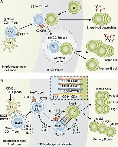 - ↑ Dagmar Breitfeld, Lars Ohl, Elisabeth Kremmer et Joachim Ellwart, « Follicular B Helper T Cells Express Cxc Chemokine Receptor 5, Localize to B Cell Follicles, and Support Immunoglobulin Production », The Journal of Experimental Medicine, vol. 192, no 11, , p. 1545–1552 (ISSN 0022-1007 et 1540-9538, PMID 11104797, PMCID PMC2193094, DOI 10.1084/jem.192.11.1545, lire en ligne, consulté le )
