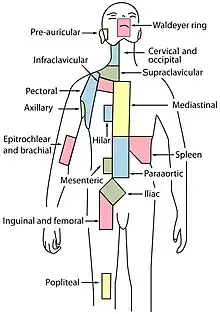 L'augmentation de taille des ganglions lymphatiques (adénopathies) est le signe le plus fréquent ; les adénopathies sont fermes, mais indolores (en dehors des classiques mais rares douleurs à l'ingestion d'alcool) et non inflammatoires. Elles sont localisées le plus souvent au niveau des aires ganglionnaires cervicales, sus-claviculaires ou axillaires. L'examen peut aussi retrouver des adénopathies des aires inguinales ou crurales, une splénomégalie ou une hépatomégalie.