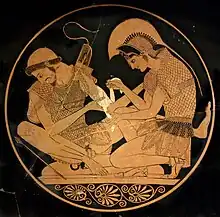 L’Iliade cite pour médecins les guerriers achéens Machaon et Podalire[1], deux fils d'Asclépios, dieu de la médecine, ainsi que le dieu Péan, médecin des dieux. Le premier est chargé notamment de soigner Ménélas[2], atteint d'une flèche. Il commence par examiner (ἰδεῖν / ideĩn, littéralement « voir ») le malade puis retire la flèche, déshabille le blessé, suce le sang de la plaie et applique des médicaments (φάρμακα / phármaka) sur lesquels nous n'avons pas de précision, si ce n'est qu'ils ont été offerts par le centaure Chiron à Asclépios, lequel les a transmis à Machaon.