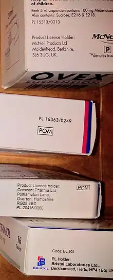 Des exemples de ceux-ci incluent certains comprimés somnifères tels que la diphenhydramine, des comprimés vermifuges humains tels que le mébendazole, des analgésiques contenant de petites quantités de codéine (jusqu'à 12,8 mg par comprimé) et pseudoéphédrine. les médicaments disponibles uniquement sur prescription sont marqués quelque part sur la boîte/contenant avec [POM]. les produits réservés aux pharmacies sont marqués d'un [P]. Une ordonnance n'est pas requise pour les médicaments [P], et les vendeurs en pharmacie sont tenus par les codes de la Royal Pharmaceutical Society (en) de poser certaines questions, qui varient en fonction de ce que dit le client. S'il demande un produit spécifique, l'assistant en pharmacie doit demander « A qui s'adresse-t-il ? », « Depuis combien de temps avez-vous les symptômes ? », « Êtes-vous allergique à un médicament ? », « Prenez-vous des médicaments ? » (questions 'WHAM'). Si un client demande un remède, par exemple contre le rhume des foins, les « questions 2WHAM » doivent être posées : « À qui s'adresse-t-il ? », « Quels sont les symptômes ? », « Depuis combien de temps avez-vous les symptômes ? Avez-vous pris des mesures face à vos symptômes ? » et « Prenez-vous d'autres médicaments ? ». C'est avec cette information que le pharmacien pourra, le cas échéant, arrêter la vente. Aucun produit [POM], [P] ou [GSL] stocké dans une pharmacie ne peut être vendu, distribué ou préfabriqué jusqu'à ce qu'un pharmacien responsable soit connecté et sur place. Certains médicaments disponibles dans les supermarchés et les stations-service sont vendus uniquement en sachets plus petits. Souvent, les paquets plus grands seront marqués [P] et disponibles uniquement en pharmacie. Fréquemment, les clients qui achètent des doses plus importantes que d'habitude de médicaments [P] (tels que le DXM, la prométhazine, la codéine ou le Gee's Linctus ) seront interrogés en raison de la possibilité d'abus.