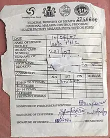 Formulaire de prescription médicale utilisé dans le cadre d’un Programme de contrôle de la malaria - Nigéria, 2001