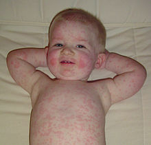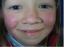 Le mégalérythème épidémique, ou l'érythème infectieux aigu, également appelé la cinquième maladie ou le syndrome des joues giflées[1],[2], est une maladie éruptive de l'enfant, contagieuse et le plus souvent bénigne, provoquée par le parvovirus B-19.