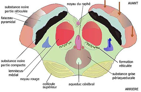 | Mésencéphale, coupe au niveau de la jonction pontomésencéphalique | Mésencéphale, coupe axiale au niveau du colliculus supérieur |