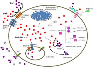 La circulation de fer entre ces quatre types cellulaires est assuré par des protéines spécifiques. Dans les années 1970-1980, on n'en connaissait que deux : la ferritine et la transferrine. En 2006, plus de 20 protéines ont été identifiées à différentes étapes du métabolisme du fer[14], dont l'hepcidine (hormone de régulation du fer dans l'organisme) et les protéines régulatrices du fer (régulation intra-cellulaire)[7].
