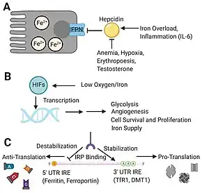 La régulation du métabolisme du fer se fait par des signaux impliquant la tension en oxygène et les besoins systémiques de fer. L'hormone principale qui régule l'absorption intestinale de fer est l'hepcidine synthétisée par le foie.