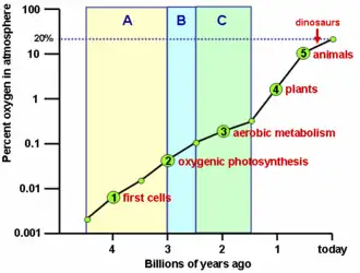 Utilisation du fer selon la teneur en oxygène de l'atmosphère depuis plus de 4 milliards d'années. A : Absence d'oxyde de fer. B : Bandes d'oxyde de fer dans des roches marines (présence d'oxygène dans les océans). C : Bandes d'oxyde de fer dans des roches terrestres (présence d'oxygène dans l'atmosphère).