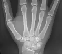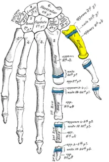 Les métacarpiens ont deux points d'ossification : un primaire dans la diaphyse pour la base et le corps et un secondaire dans la tête.