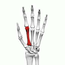 Sur le côté palmaire et latéral de la base se trouve l'insertion du tendon du muscle long abducteur du pouce, généralement doté d'un petit tubercule.