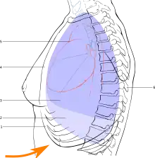 La compression (flèche orange), possible grâce à la présence de la colonne vertébrale (6) qui joue le rôle de « plan dur », passe sous la cage thoracique (1, 4) et permet de comprimer les poumons (2 ,3).