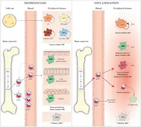 La plupart des macrophages résidents des tissus sont des macrophages embryonnaires. Ils dérivent directement de cellules de la vésicule vitelline et sont capables d'auto-renouvellement et de maintenance indépendamment des monocytes[7]. La première vague, appelée vague primitive, commence au septième jour de la vie embryonnaire 6,5 dans le sac vitellin[8]. Cette vague établit une population de progéniteurs exclusifs aux macrophages qui se différencient ensuite en progéniteurs érythroïdes et myéloïdes entre le neuvième et le onzième jour au cours de la vague pro-définitive[9]. Une population intermédiaire de pré-macrophages (p-Mac) est dérivée des progéniteurs myéloïdes sans devenir au préalable des monocytes[10]. La population de progéniteurs (érythroïdes et myéloïdes) et de p-Mac se développe pendant plusieurs jours dans le sac vitellin et migre vers le foie fœtal avent le quinzième jour. Entre le treizième et le dix-huitième jour, les p-Mac du foie fœtal migrent et ensemencent d'autres tissus pour établir des populations à vie de macrophages résidant dans les tissus. La troisième vague d'hématopoïèse, la vague définitive, débute vers le dix-huitième jour et implique l'établissement de cellules souches hématopoïétiques dans la moelle osseuse. Bien que tous les macrophages résidant dans les tissus proviennent des p-Mac du foie fœtal, les macrophages dérivés de la moelle osseuse remplacent la population fœtale dans les intestins, la rate, la peau et le cœur[11]. Cependant, il convient de noter que ces populations de macrophages dérivées de cellules souches hématopoïétiques sont maintenues par auto-renouvellement avec une contribution minimale des monocytes en circulation à la suite de leur colonisation des tissus[12].