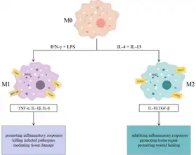 L'existence de deux catégories de macrophages nommées M1 et M2 a été proposée depuis les années 2000[20]. Les M1 sont impliqués dans la destruction des agents pathogènes. Les M2 sont impliqués dans la réparation et cicatrisation cellulaire. Cette différenciation se fait par une dégradation différente de l'arginine en oxyde nitrique dans le cas de M1 et en ornithine dans le cas de M2[20]. Les macrophages forment une population "plastique" : ils peuvent passer d'un phénotype à l'autre in vivo. On parle de polarisation des macrophages pour désigner le processus par lequel les macrophages exhibent un phénotype spécifique et une réponse fonctionnelle aux stimuli du microenvironnement et aux signaux rencontrés par les macrophages dans des tissus spécifiques[21].