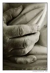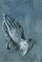 - Dans l'histoire de la peinture figurative, la représentation des mains a toujours revêtu une importance particulière[20]. Entre autres exemples : Pablo Picasso, Jaime Sabartés (le Bock), 1901 ; Oskar Kokoschka, Hans Tietze & Erica Tietze-Conrat, 1909 ; Maria Blanchard, Les Deux Orphelins, 1923 ; Jean Fautrier, Trois vieilles femmes, 1924 ; Otto Dix, Martha Dix tenant son fils Jan dans ses bras, 1925 ; George Grosz, Selbstbildnis als Warner, 1927 ; Salvador Dalí, La main, 1930 ; Max Beckmann, Autoportrait à la flûte de champagne, 1932 ; Amrita Sher-Gil, Portrait de Marie-Louise Chassany, 1932 ; Francis Picabia, L'Adoration du veau, 1941-1942 ; Lois Malou Jones, Mob Victim (Meditation), 1944 ; Irma Stern, Malay Woman, 1944 ; David Alfaro Siqueiros, Nuestra imagen actual, 1947 ; Candido Portinari, Operario, 1947.