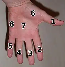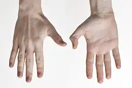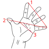 - ↑ La pointe du pouce plus allongé peut ainsi toucher la pointe de tous les autres doigts.