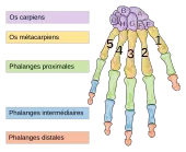 Le squelette d'une main d'un adulte comporte en principe 27 os, répartis en trois groupes : le carpe, le métacarpe et le squelette des doigts[9]. Toutes les articulations de la main sont synoviales.