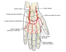 L'arcade carpienne palmaire donne des branches à destination de la région du carpe. L'arcade carpienne dorsale donne les artères métacarpiennes dorsales à destination de la région du métacarpe. L'arcade palmaire profonde donne les artères métacarpiennes palmaires à destination du métacarpe. L'arcade palmaire superficielle donne les artères digitales communes à destination des doigts.