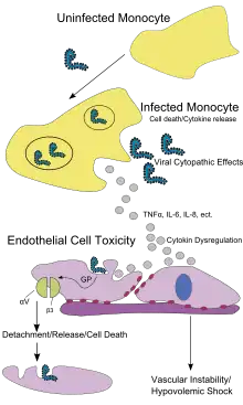 Une fois le virus dans la cellule, il sécrète la glycoprotéine soluble sGP et la glycoprotéine structurelle GP. La réplication du virus sature la biosynthèse des protéines dans les cellules infectées et notamment celles du système immunitaire de l'hôte. La glycoprotéine GP forme un complexe trimérique liant le virus aux cellules endothéliales qui tapissent l'intérieur des vaisseaux sanguins, tandis que la glycoprotéine sécrétée sGP forme un dimère qui interfère avec les granulocytes neutrophiles, un type de leucocytes, permettant au virus d'échapper au système immunitaire de l'hôte par inactivation précoce des neutrophiles. Ces leucocytes inactivés servent alors de transporteurs du virus à travers l'ensemble de l'organisme pour notamment contaminer les ganglions lymphatiques, le foie, les poumons et la rate[36]. La présence des particules virales et les dommages causées aux cellules par leur éclosion provoquent la libération de cytokinesTNFα, IL-6, IL-8, etc. — qui sont les molécules de signalisation cellulaire provoquant fièvre et inflammation. L'atteinte des cellules épithéliales par effet cytopathique conduit à la perte de l'intégrité vasculaire, aggravée d'une part par la glycoprotéine virale qui réduit l'efficacité des intégrines responsables de l'adhérence des cellules au sein des structures intercellulaires, et d'autre part par les atteintes hépatiques, responsables de la coagulopathie[37].