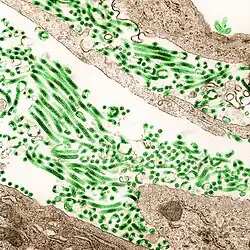 Image colorisée montrant des particules virales Ebola (en vert) bourgeonnant de cellules de rein (en brun) d'un singe vert infecté et envahissant le milieu extracellulaire réalisée par microscopie électronique en transmission en octobre 2014[38].