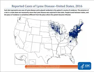 - ↑ À ne pas confondre avec la sous-notification, une maladie peut être diagnostiquée et traitée (à tort ou à raison) sans être signalée aux systèmes de surveillance. Voir https://www.cdc.gov/lyme/stats/humancases.html.