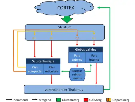 Le modèle de Delong (1990)[23] vise à expliquer les désordres moteurs prenant leur origine dans les ganglions de la base (GB). Il constitue une première approche pour expliquer les symptômes d'akinésie et de dyskinésie des syndromes parkinsoniens, ces derniers apparaissant alors par une rupture d'équilibre entre les informations en provenance de la voie directe et celles en provenance de la voie indirecte des ganglions de la base. En situation physiologique, les neurones dopaminergiques de la substance noire ont un effet excitateur sur la voie directe des GB et inhibiteur sur leur voie indirecte. En situation de maladie de Parkinson, il y aurait en revanche affaiblissement de la voie directe et renforcement de la voie indirecte.