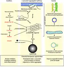 Les processus biologiques suspectés d'entraîner la perte neuronale sont multiples : dysfonctionnement mitochondrial, apoptose, accumulation de protéines neurotoxiques et stress oxydant affectant la réparation de l'ADN neuronal lors de stress physicochimiques du neurone ; l'hyperactivation inappropriée de la protéine Cdk5 (kinase cycline-dépendante 5 (en)) normalement présente dans les neurones, supprime l'enzyme APE1 (voir Endonucléase) nécessaire à la réparation de l'ADN, ce qui peut conduire à la destruction de neurones. En 2003, il a été montré que la voie Cdk5-APE1 était perturbée chez des patients victimes de la maladie de Parkinson ou d'Alzheimer[14],[15],[16]. De même, une protéine mal conformée, l'α-synucléine, s'accumule anormalement dans les corps de Lewy et les neurites[2]. Selon certains auteurs cette protéine aurait un comportement infectieux de type prion[17].