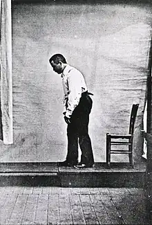 - akinésie : elle consiste en une rareté et une lenteur des mouvements (bradykinésie). Elle se manifeste aussi par une perturbation de la mimique et des mouvements automatiques comme ceux de la marche. La bradykinésie peut s'associer à une réduction de l'amplitude des mouvements[1]. L'akinésie est le signe le plus important de la maladie (symptôme chez 88 % des parkinsoniens). Le patient a un visage impassible, la bouche entrouverte, clignant rarement des yeux. La marche est lente à petits pas, parfois entrecoupée d'arrêts avec piétinement. Elle est parfois rapide (festination). Le malade penché en avant paraît courir après son centre de gravité. Il y a toujours une perte du ballant des bras. Les mouvements alternatifs rapides des membres (épreuve des marionnettes) sont mal réalisés.