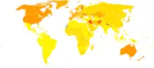 L'exposition à certains pesticides, notamment organophosphorés ou à base de cuivre[56], augmenterait le risque de développer une maladie de Parkinson de près de 70 % : 5 % des personnes exposées aux pesticides risqueraient de développer la maladie contre 3 % pour la population générale[57]. Cette maladie est effectivement plus fréquente en milieu rural qu'urbain. Un modèle animal confirme la responsabilité d'un pesticide, le roténone (agissant comme inhibiteur de l'activité mitochondriale), dans la constitution d'un syndrome parkinsonien incluant bradykinésie, instabilité posturale, démarche chancelante et tremblements [58]. Les organochlorés — interdits dans les pays développés, mais persistants dans l'environnement — seraient les premiers responsables (risque jusqu'à 2,4 fois plus élevé que la normale). Le risque est multiplié par trois si certains pesticides sont associés[59]. Le risque pourrait doubler en cas d'exposition à certains pesticides, tels que la roténone (un pesticide utilisé même en Agriculture biologique jusqu'en 2011) ou le paraquat (interdit dans l'UE), et herbicides, tel que l'agent orange[3],[60],[55]. Les pesticides augmentant le risque de maladie de Parkinson comportent le roténone, le paraquat, le carbamate, l'organochlorine (composant du DDT), le pyréthroide ou encore l'heptachlore[27]. Une étude sur l'agent orange a mis en évidence que certains facteurs d'exposition indirecte aux pesticides, par exemple la vie en milieu rural, augmentaient également le risque[55].