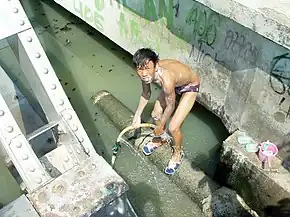 La pauvreté est une cause majeure de manque d'accès à l'eau potable, et par suite de maladies hydriques, infectieuses et parasitaires notamment (dont parfois dans les grandes villes comme ici à Jakarta ; ville pourtant située dans un pays où l'eau est abondante)