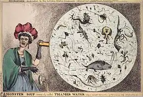 Dessin satirique de 1828 relatif à l'eau de la Tamise intitulé Soupe de monstres communément appelée l'eau de la Tamise (Monster Soup commonly called Thames Water)